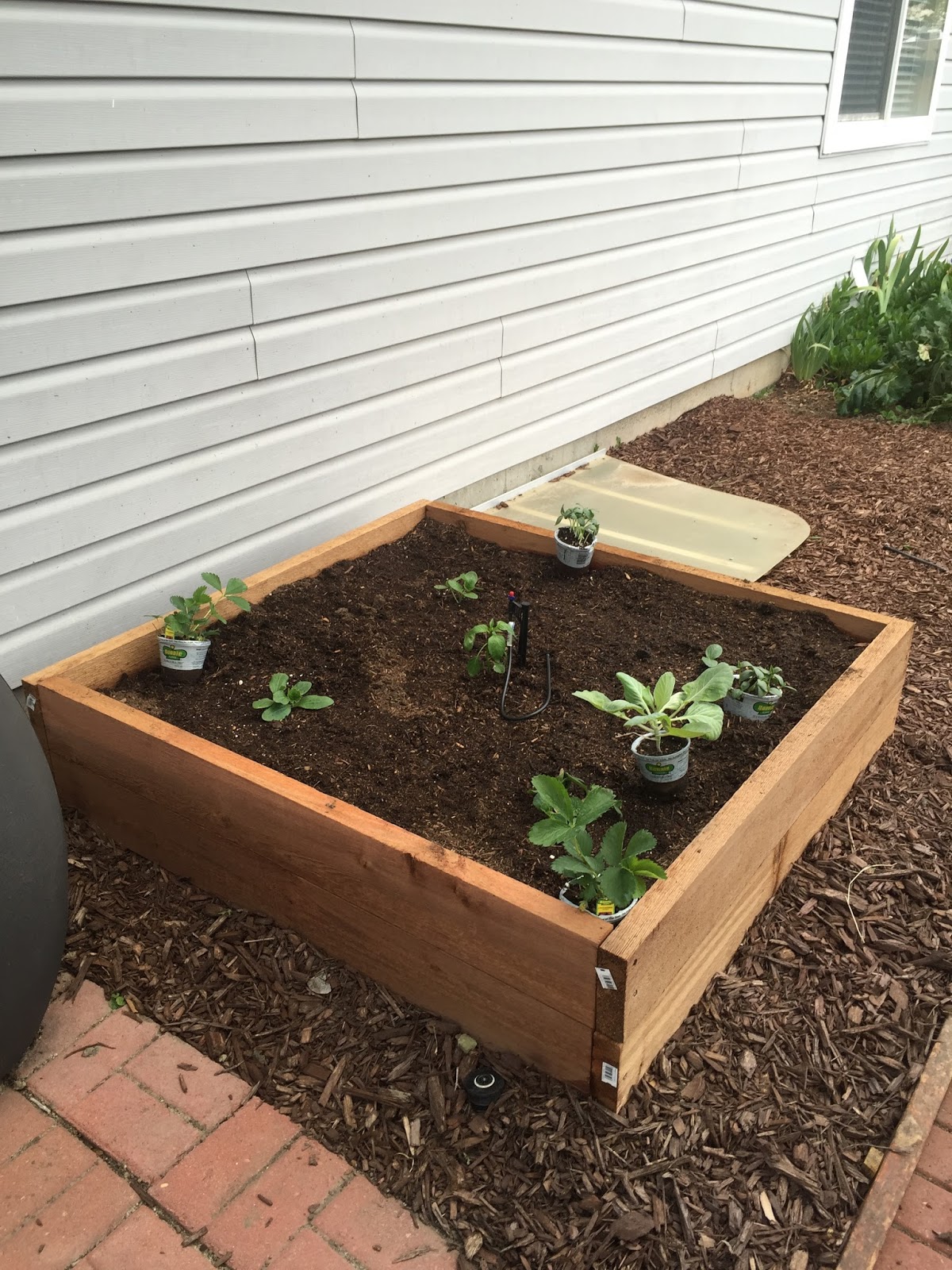 Naturally we had to plant our fledgling little garden amidst all this vicious hail. In fact, we've been finishing up work on our back side-yard, and frankly, it looks fantastic. Jon has done an amazing job! Just add "amateur landscaper" to his resume. He laid the patio, built planter boxes, mulched everywhere, helped me plant our garden, and even installed some drip irrigation to help water our sweet little garden-- all while working full-time!